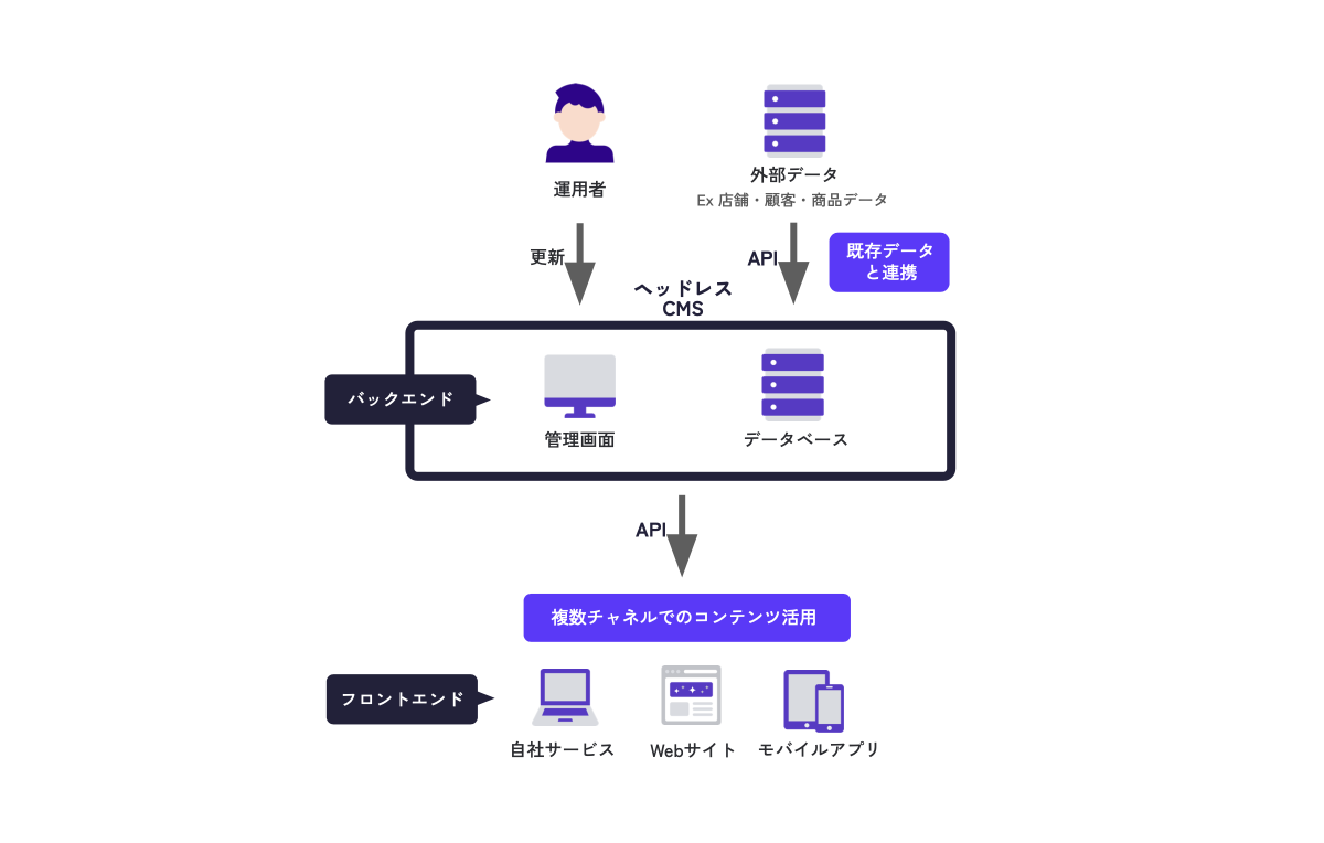 WordPressのような従来型のCMSは、管理画面、データベース、テンプレート、フロントエンドなどが一体となっています。対してヘッドレスCMSは、表示画面(=フロントエンド)と裏側のシステム(=バックエンド)が完全に分離しているのが特徴です。コンテンツはAPIを通じて提供されるので、フロントエンド技術に縛られず、React、Astro、Next.js、Nuxt.jsなど好きな技術スタックでフロントエンドを実装できます。