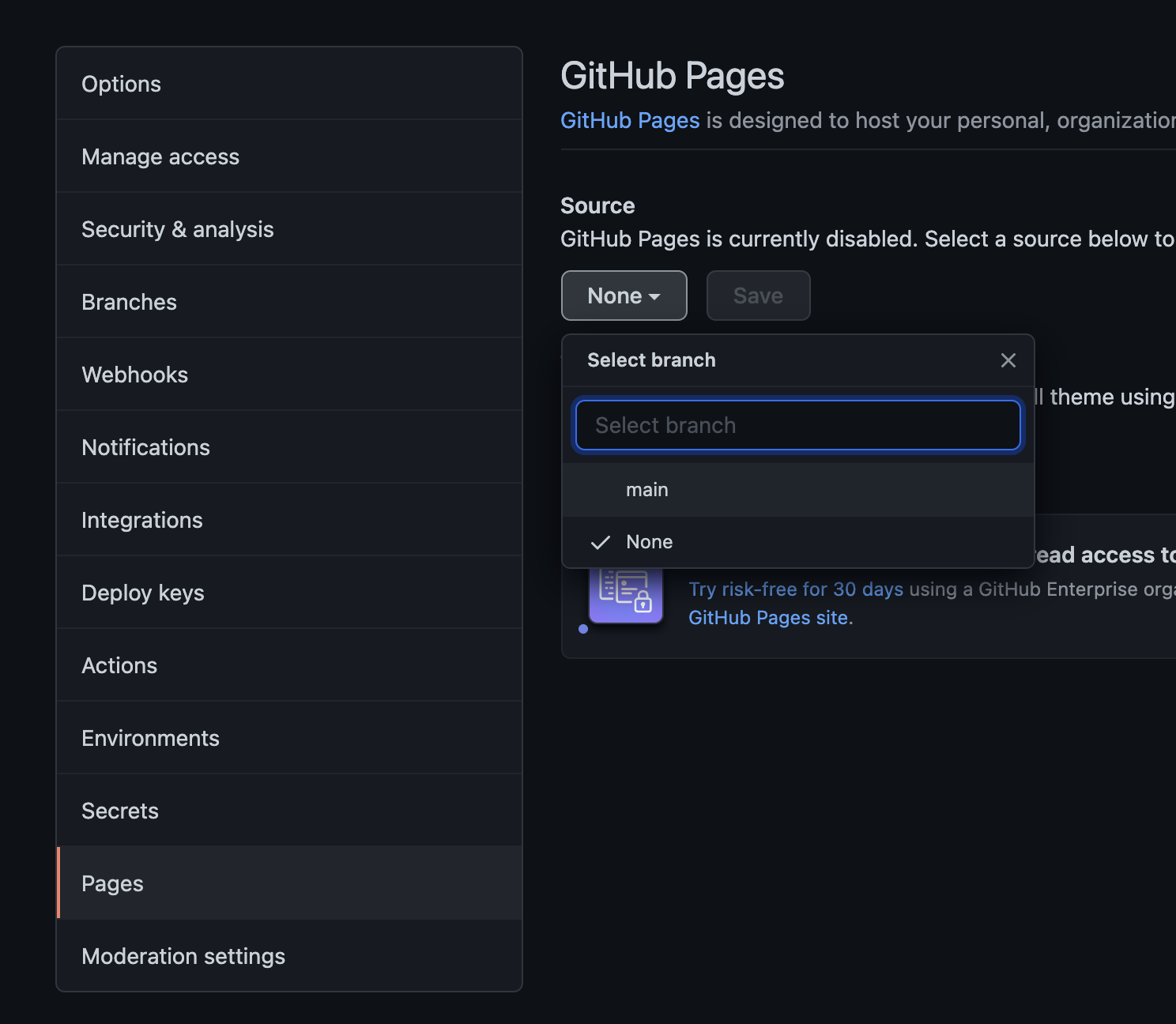 続いてSettingsタブ > Pagesからブランチを選択します。