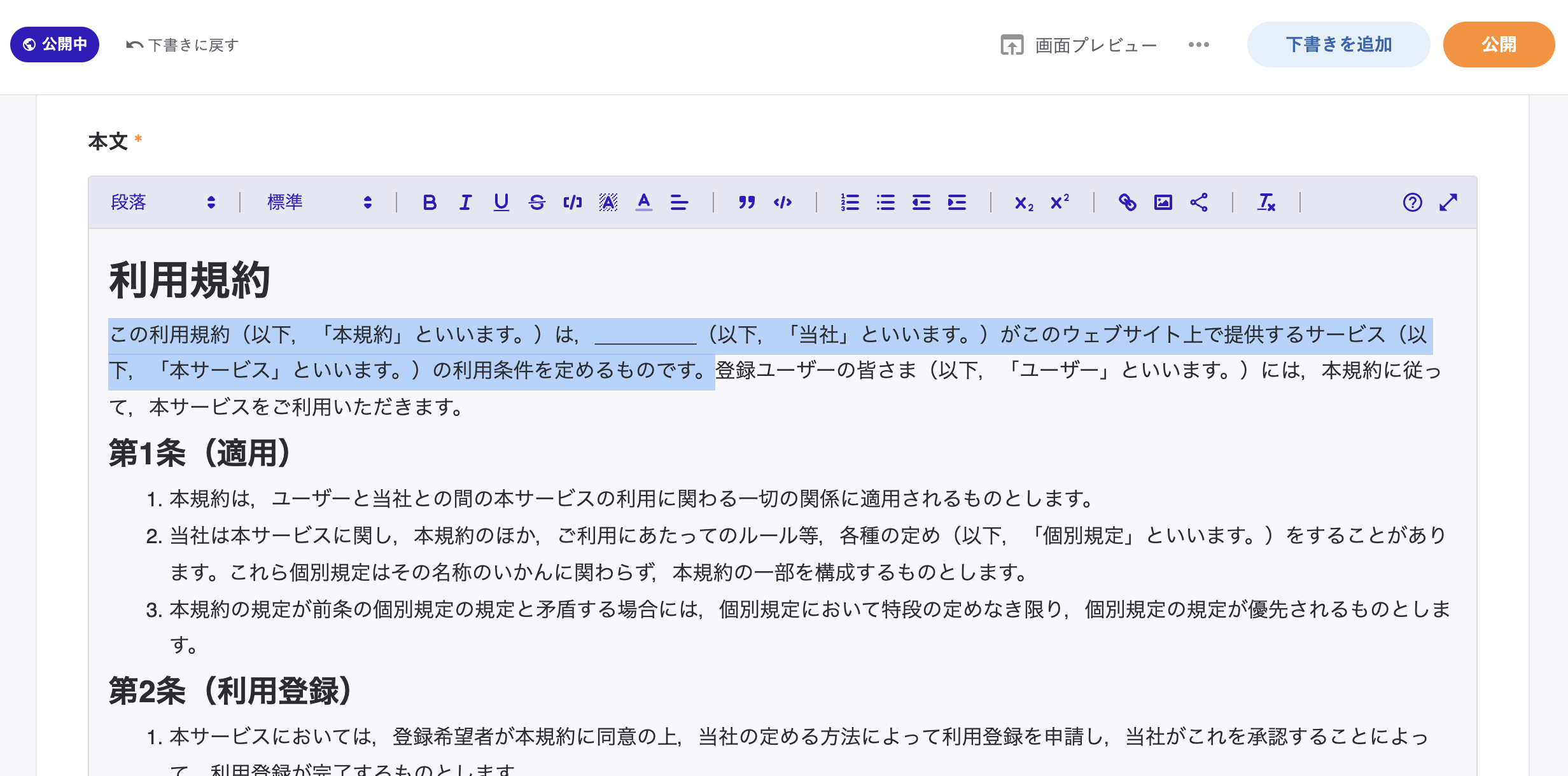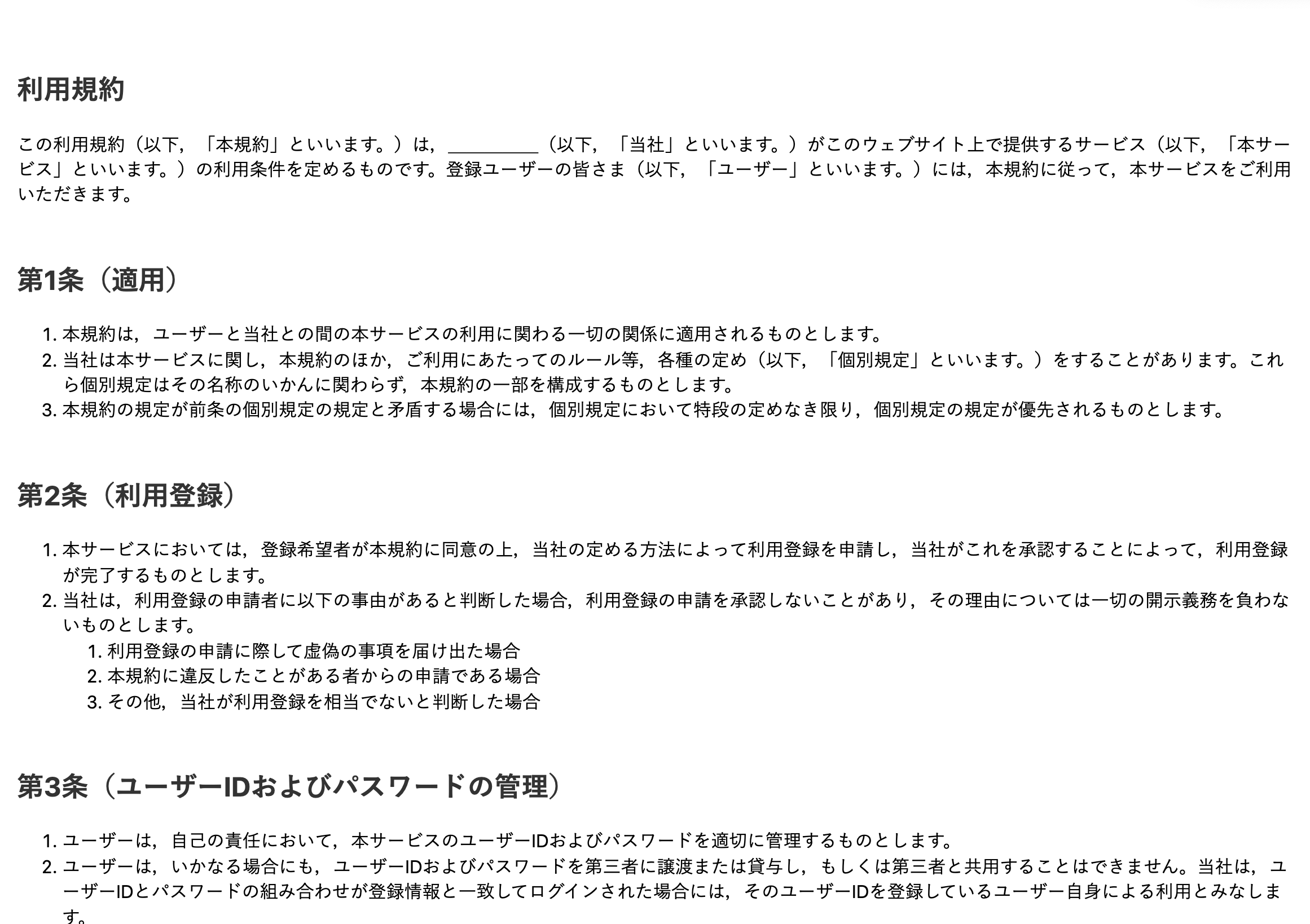 今回は「Webサイトの利用規約」さんの雛形を利用させていただきました。