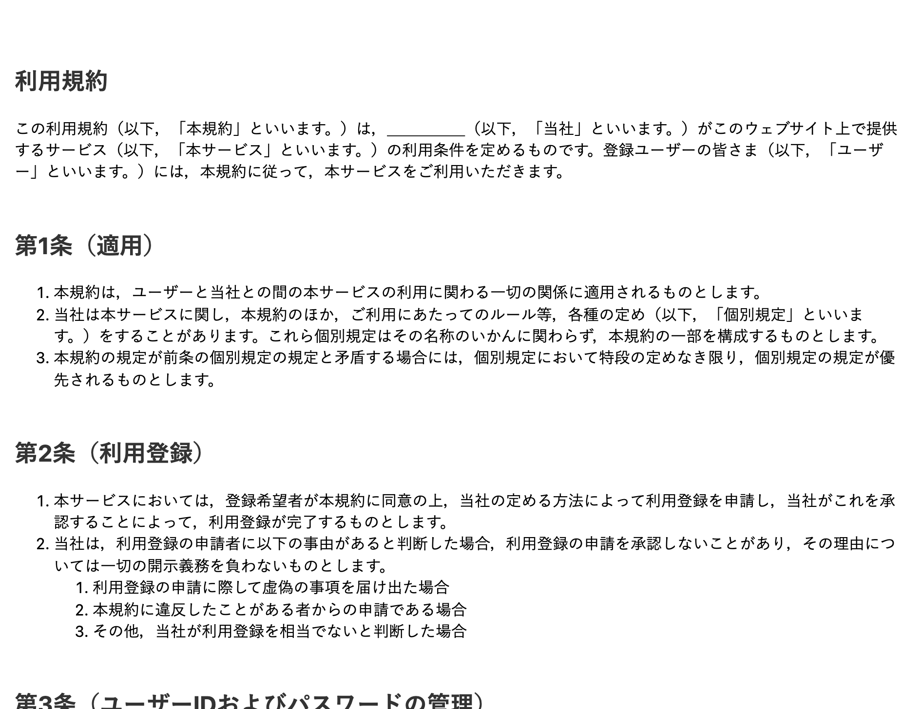 "body": "<h1 id=\"h8e07617365\">利用規約</h1><p>この利用規約(以下,「本規約」といいます。)は,_____(以下,「当社」といいます。)がこのウェブサイト上で提供するサービス(以下,「本サービス」といいます。)の利用条件を定めるも..."