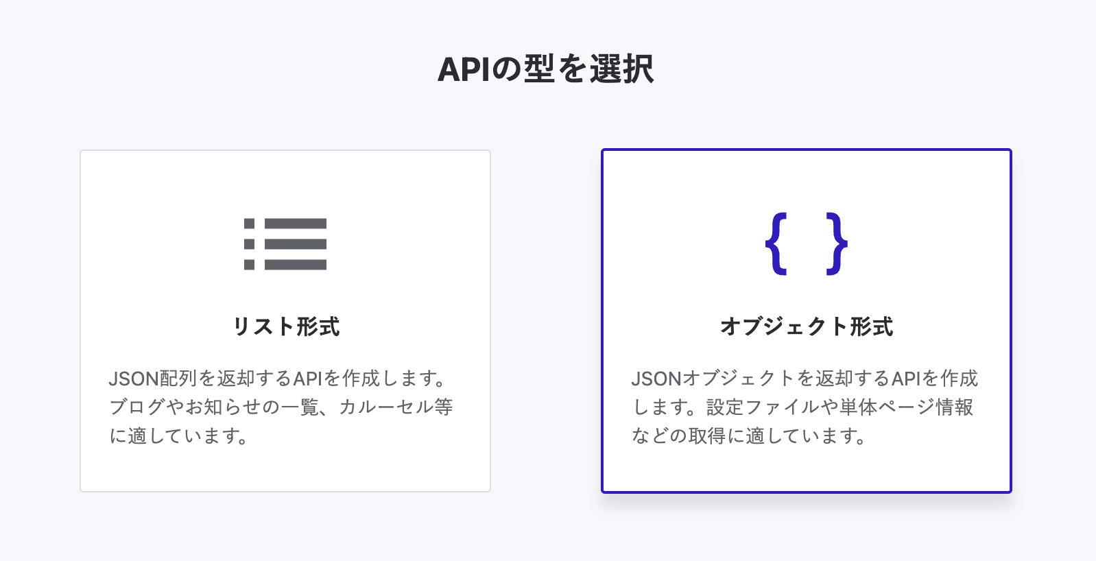 利用規約は単一のコンテンツになるためAPIの型は「オブジェクト形式」を選択します。