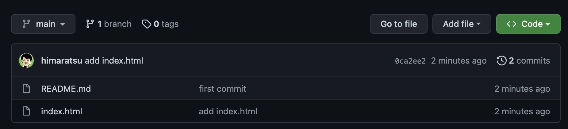 リポジトリを作成し、先ほど作成した index.html をGitHubにcommitします。