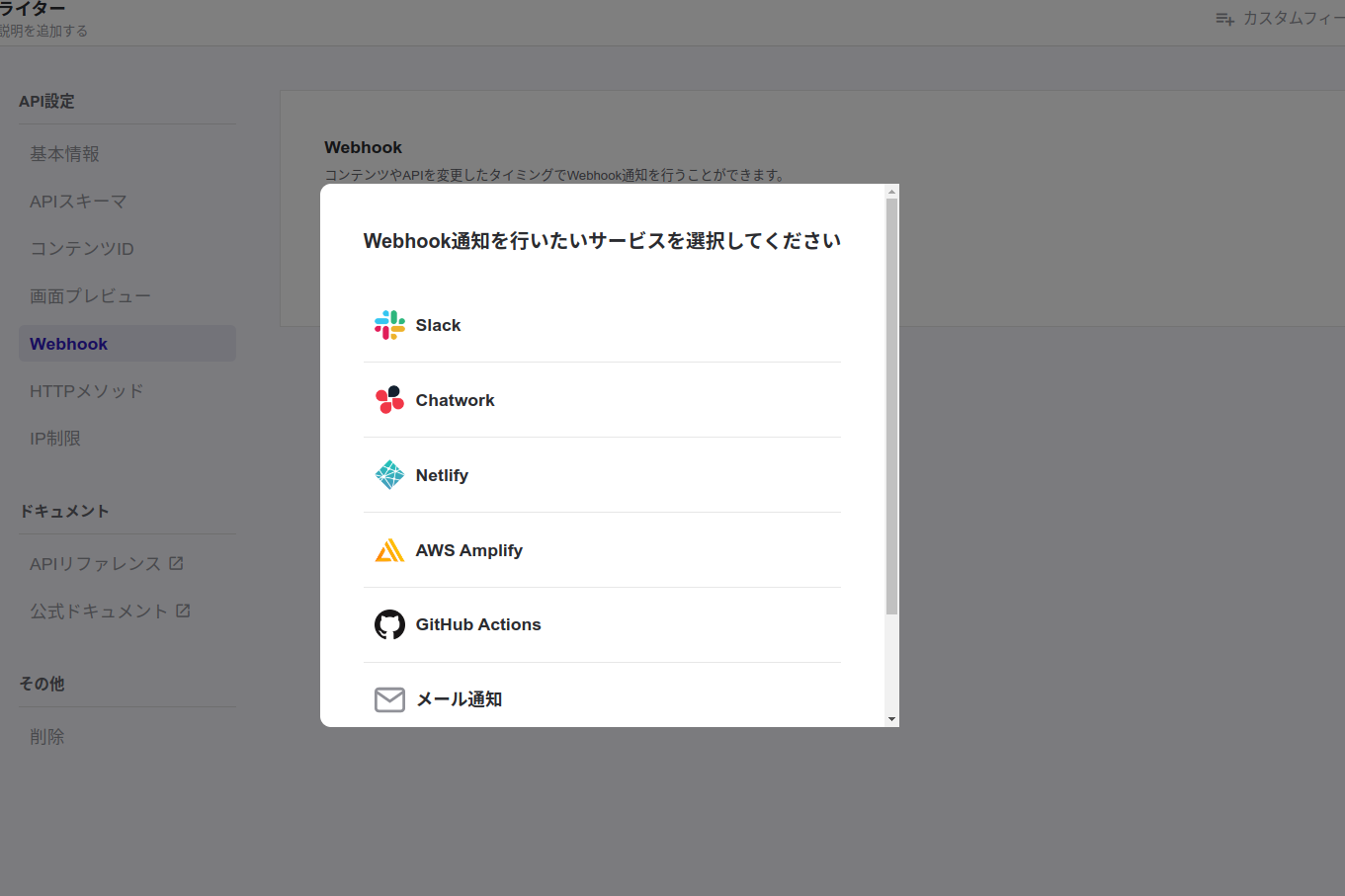 react-hooks-use-modalはmicroCMSの管理画面内部にも使われています。例えばWebhook追加時のモーダルコンポーネントです。