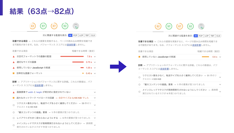 実際のサイトでスコアの改善(63点→82点)も行いました。