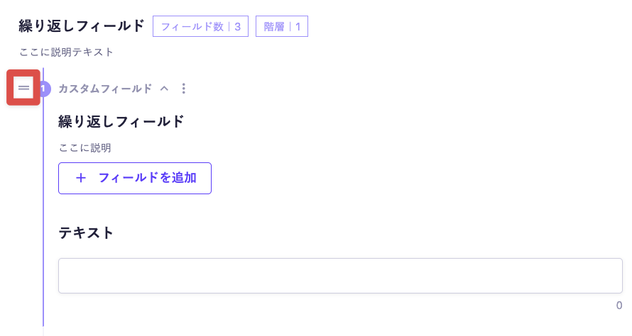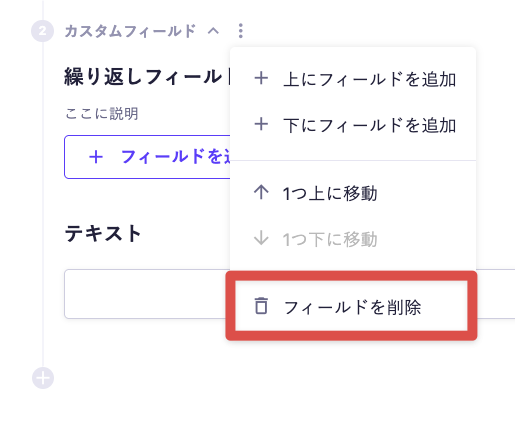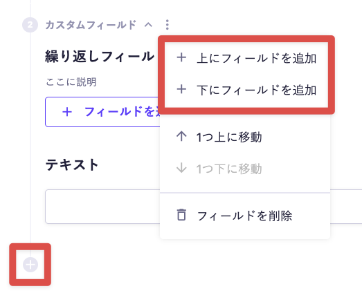 各フィールド左下の [+] ボタン、または3点リーダーを展開して [上 / 下にフィールドを追加] で、同じ階層にフィールドを追加します。
