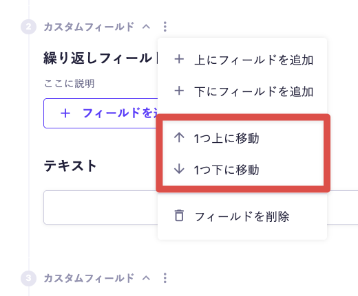 または、3点リーダーを展開して [1つ上 / 下に移動] からフィールドを移動します。