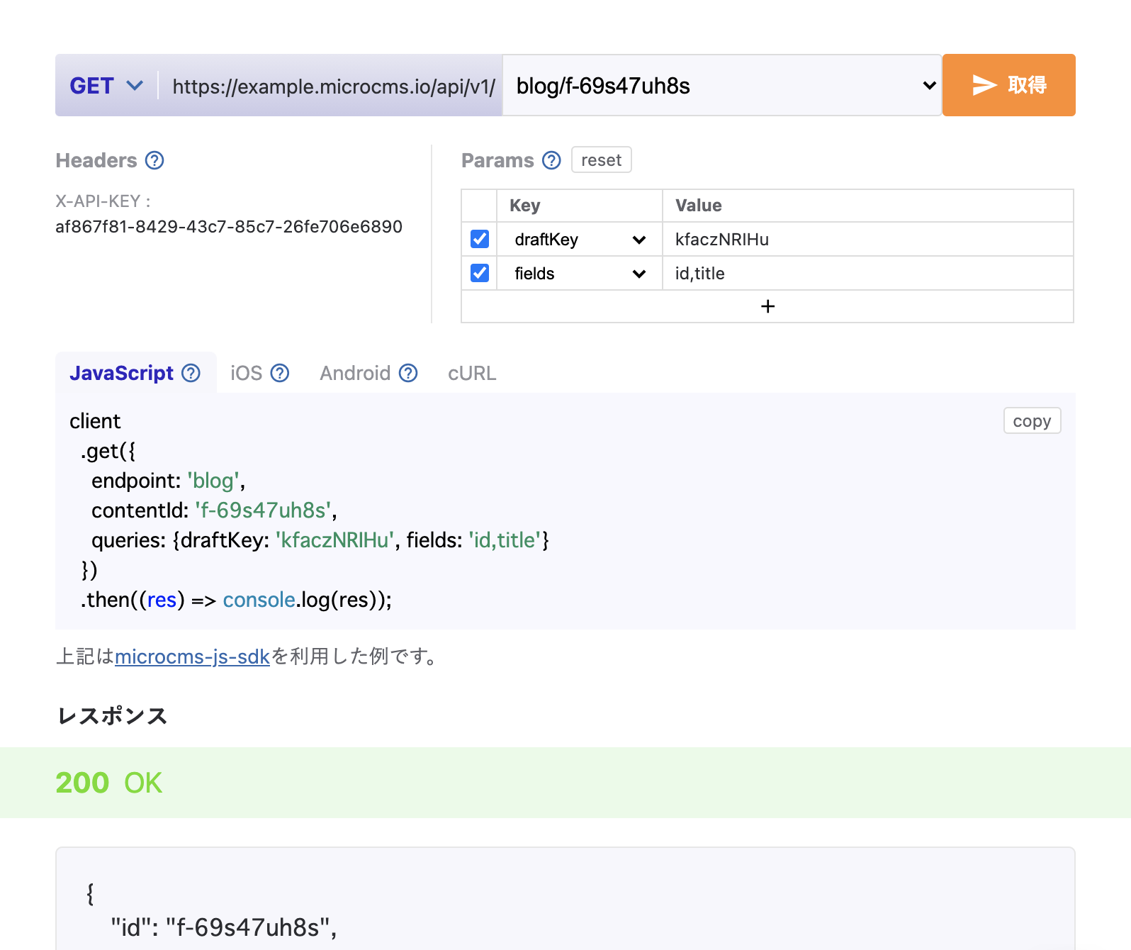 選択中のエンドポイント、コンテンツID、GETパラメータに応じて動的に変わるようになっておりますので、是非ご利用ください。