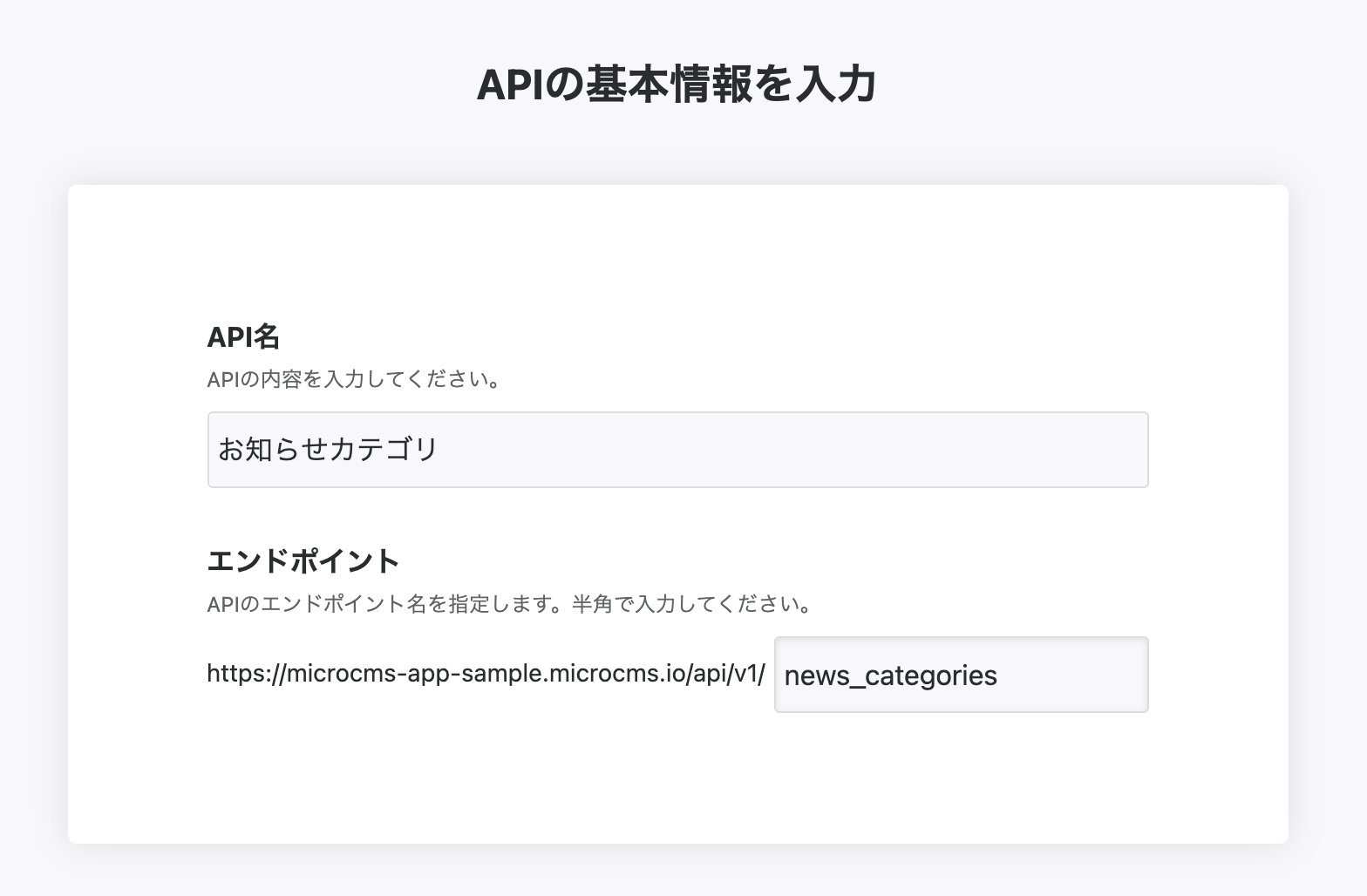 まずはAPI名とエンドポイントを決めましょう。今回は「お知らせカテゴリ」、「news_categories」として進めます。