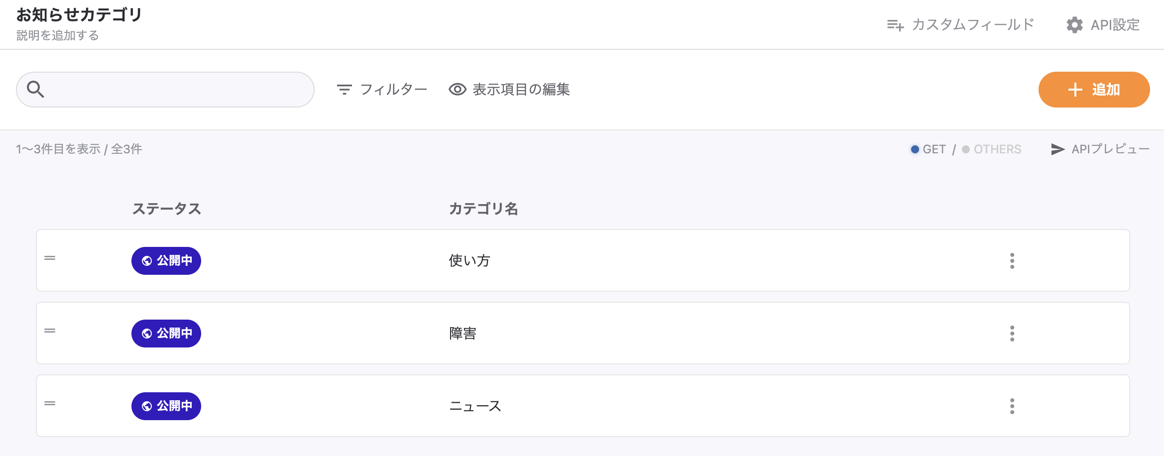 今回は「使い方」「障害」「ニュース」の3つのお知らせカテゴリを作成しました。