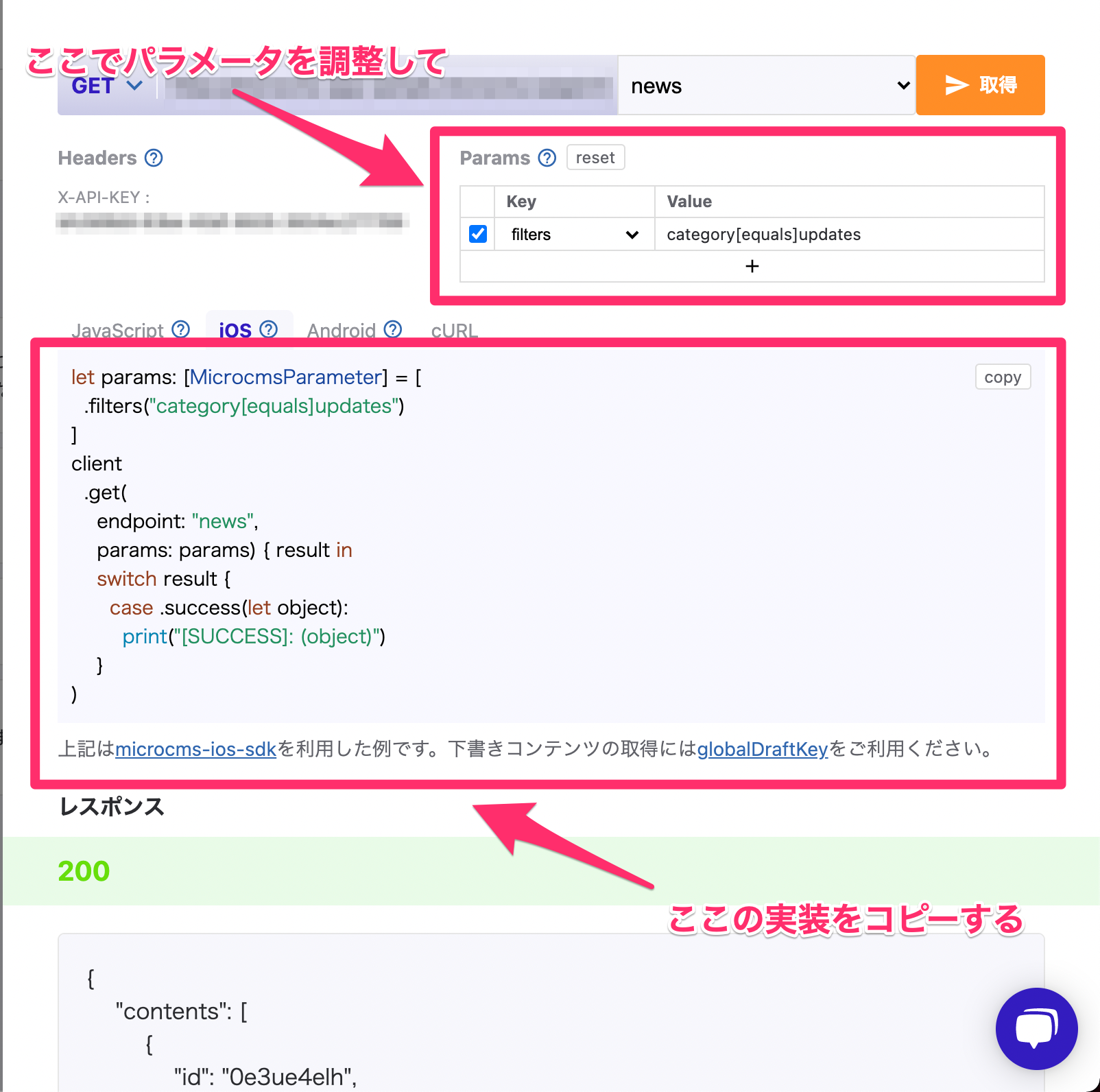 実際のレスポンスを確認しながらパラメータを調整できます。iOS SDKを使った場合のコードサンプルも表示されるのでクイックに実装できます。