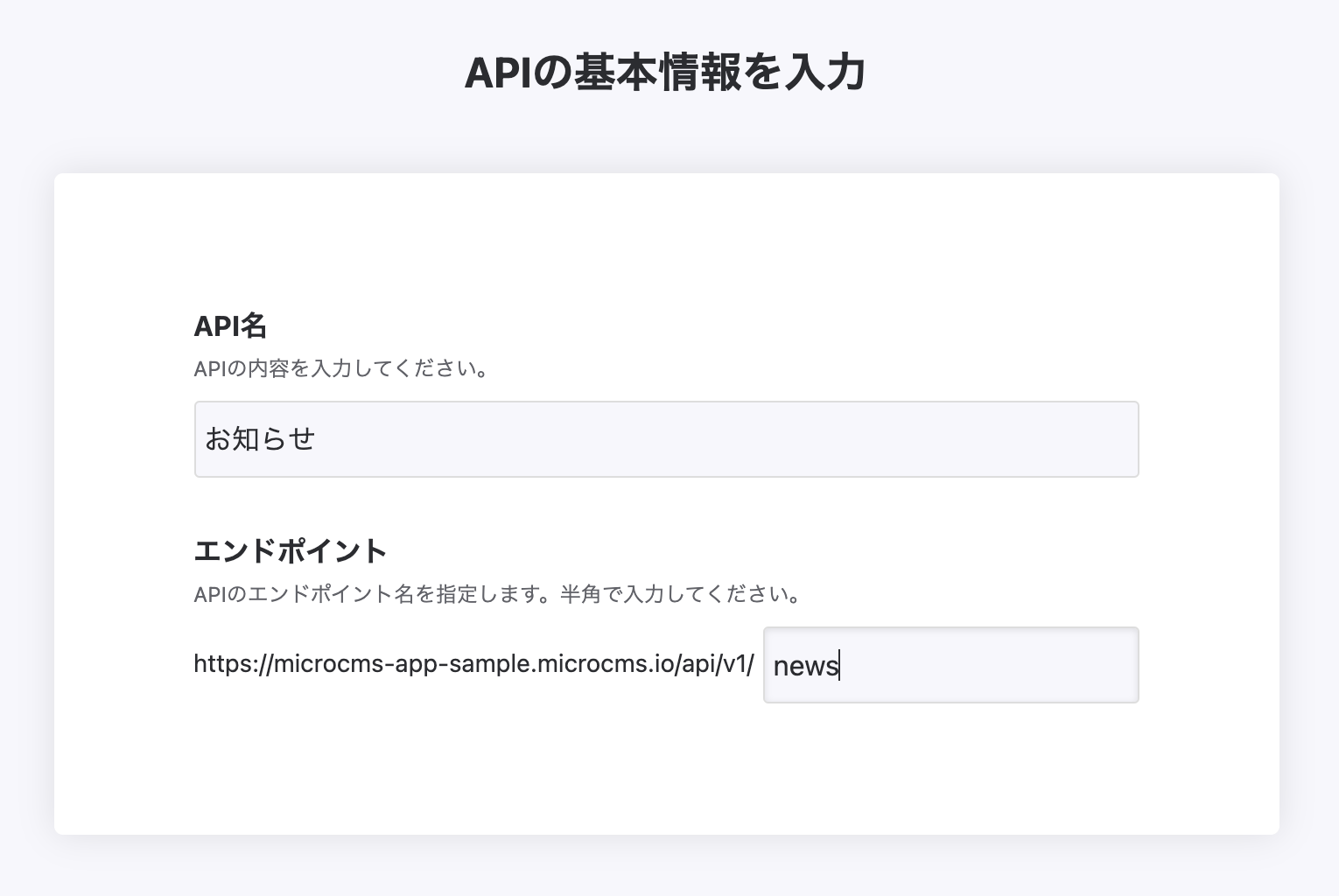 先ほどと同様に、まずはAPI名とエンドポイントを決めます。ここでは「お知らせ」、「news」とします。