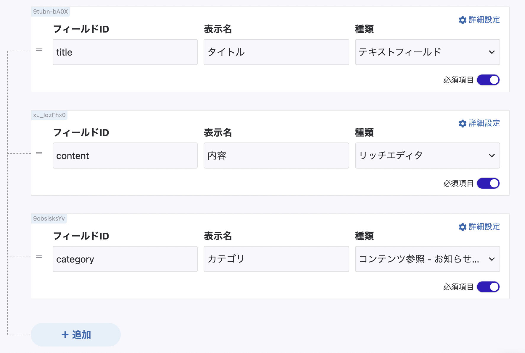 APIスキーマはタイトルと内容、そしてカテゴリを定義します。