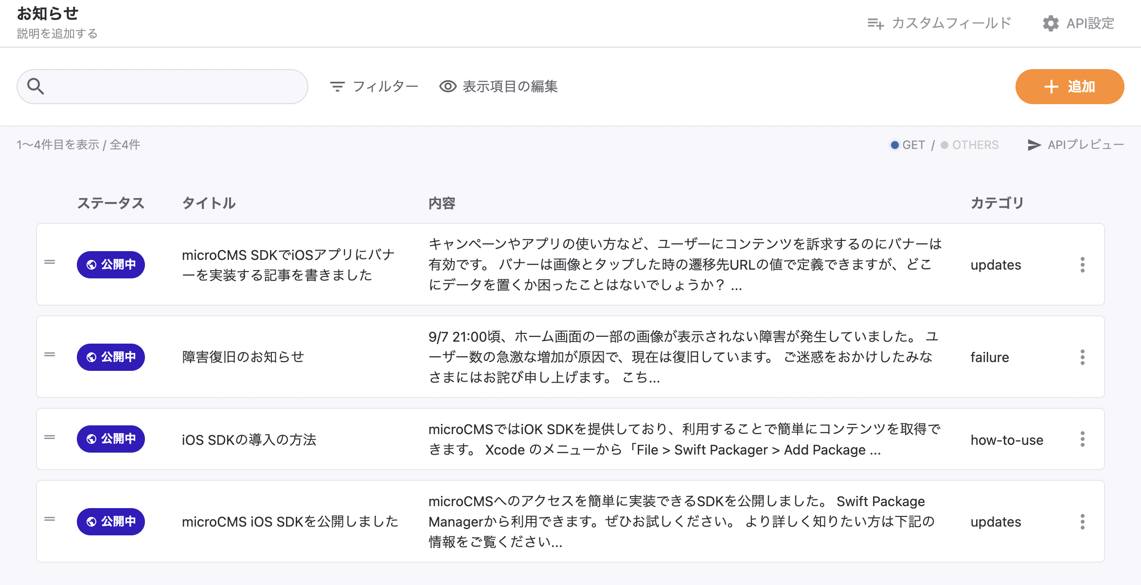 APIが作成できたらいくつかお知らせを入稿します。