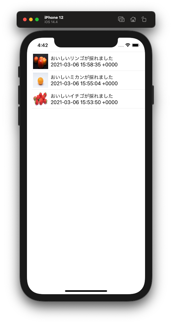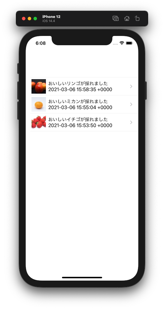 今回はまず、こちらの一覧画面の行をタップすると詳細画面に遷移するようにしていきます。