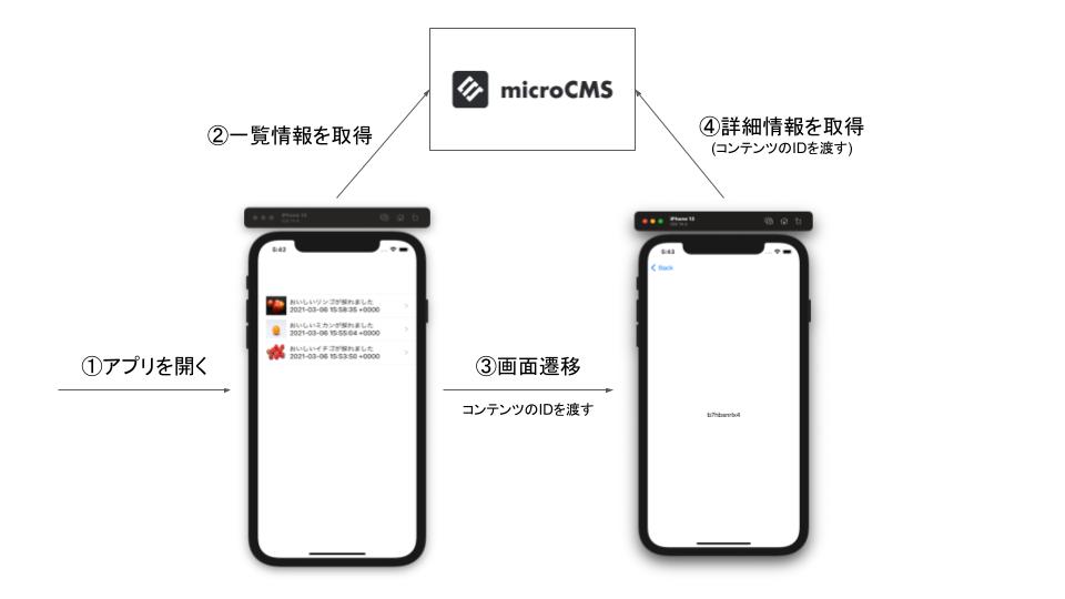 こういった要件が出てきた場合にもうまく画面表示ができるような想定をして、今回は以下のように一覧画面・詳細画面のそれぞれでmicroCMSよりデータ取得を行います。
