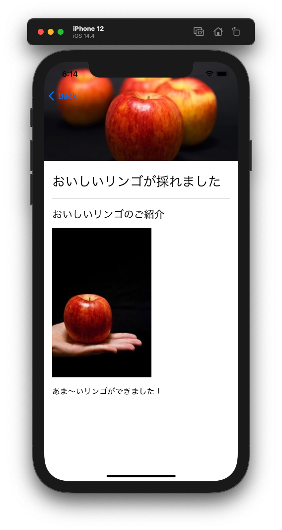 ここまでの実装で一覧画面→詳細画面の遷移と、詳細画面内の具体的な表示を実装することができました。
