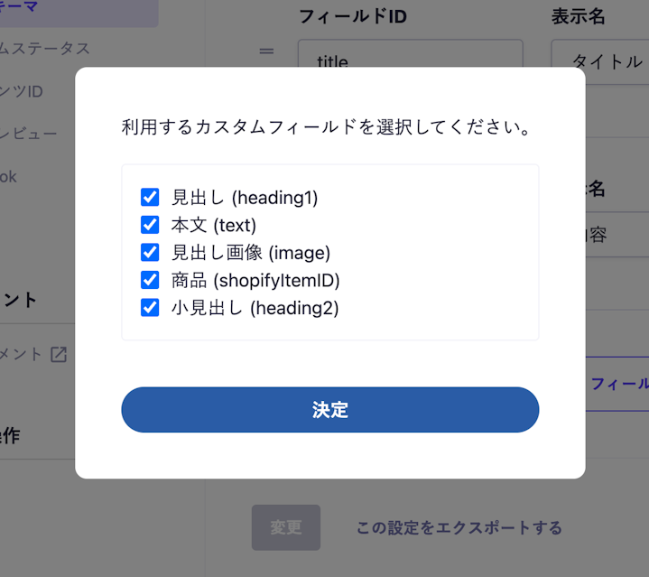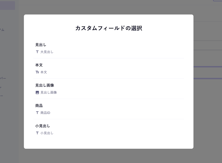 「+ フィールドを追加」を選択すると、追加するフィールドの種類を選択するモーダルが開きます。