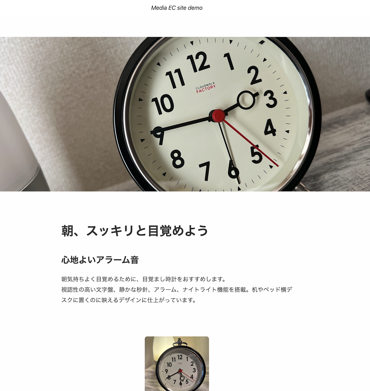商品についての記事が書かれていて、その途中で商品の購入リンクが挟まれています。記事の情報は microCMS から、商品の情報は Shopify から取得しています。