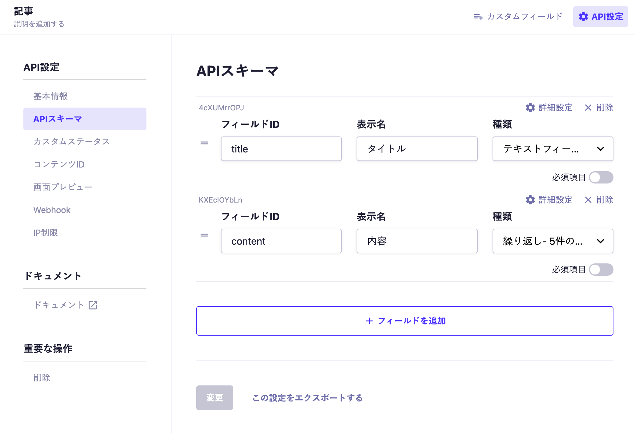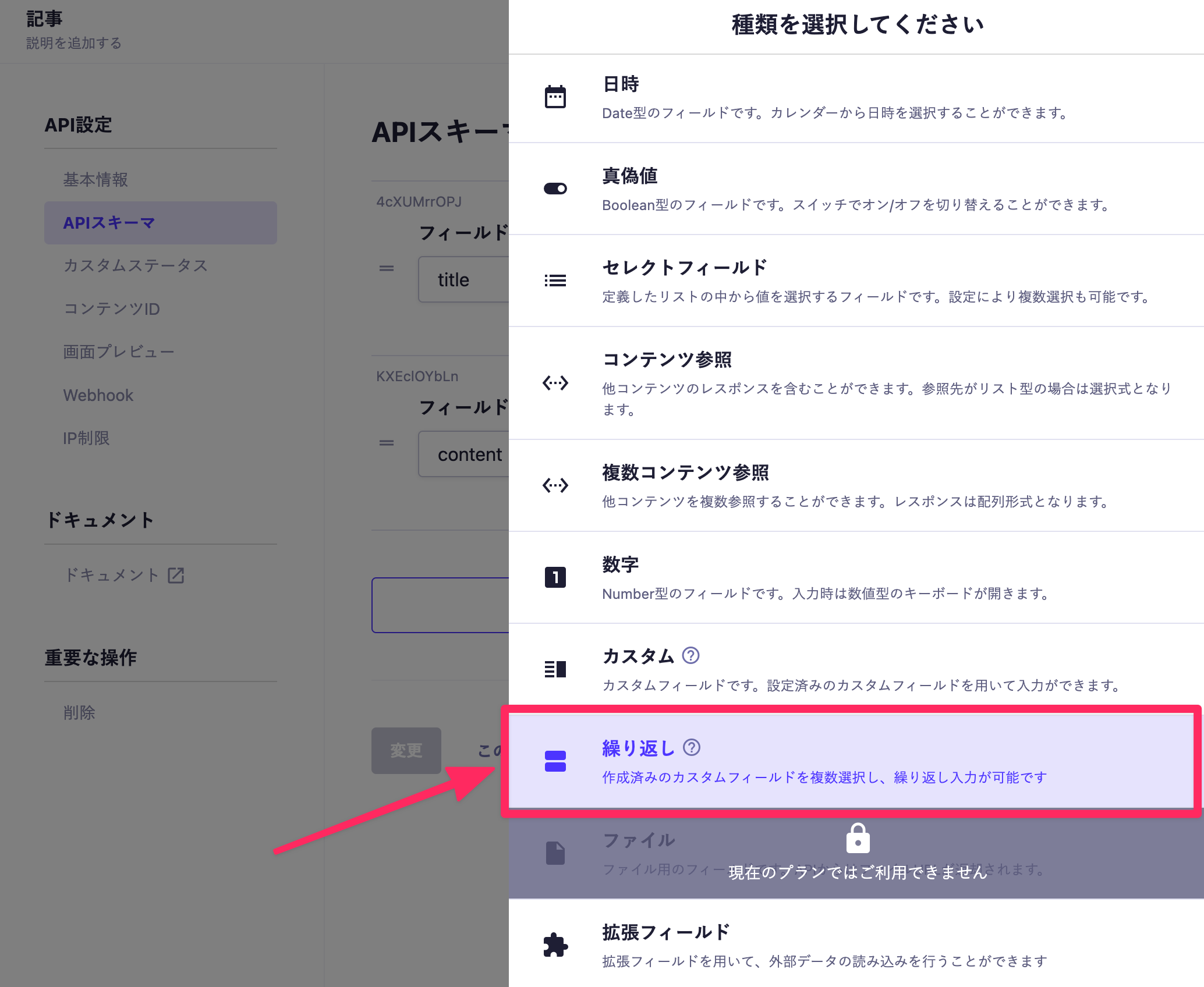 定義できたらAPIスキーマで「繰り返しフィールド」を選び、