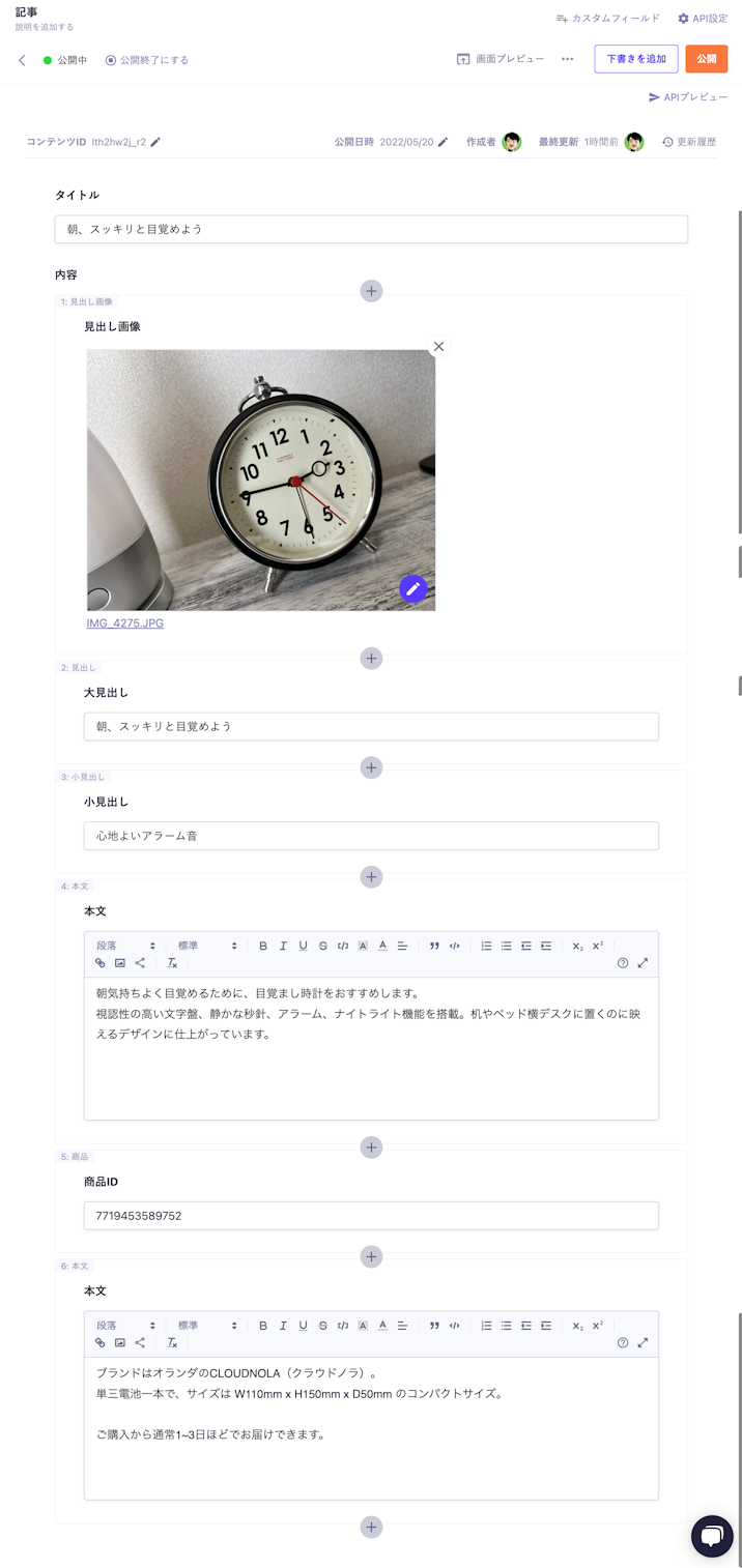 大見出し、小見出し、見出し画像、本文、そして途中に「商品ID」が定義されています。