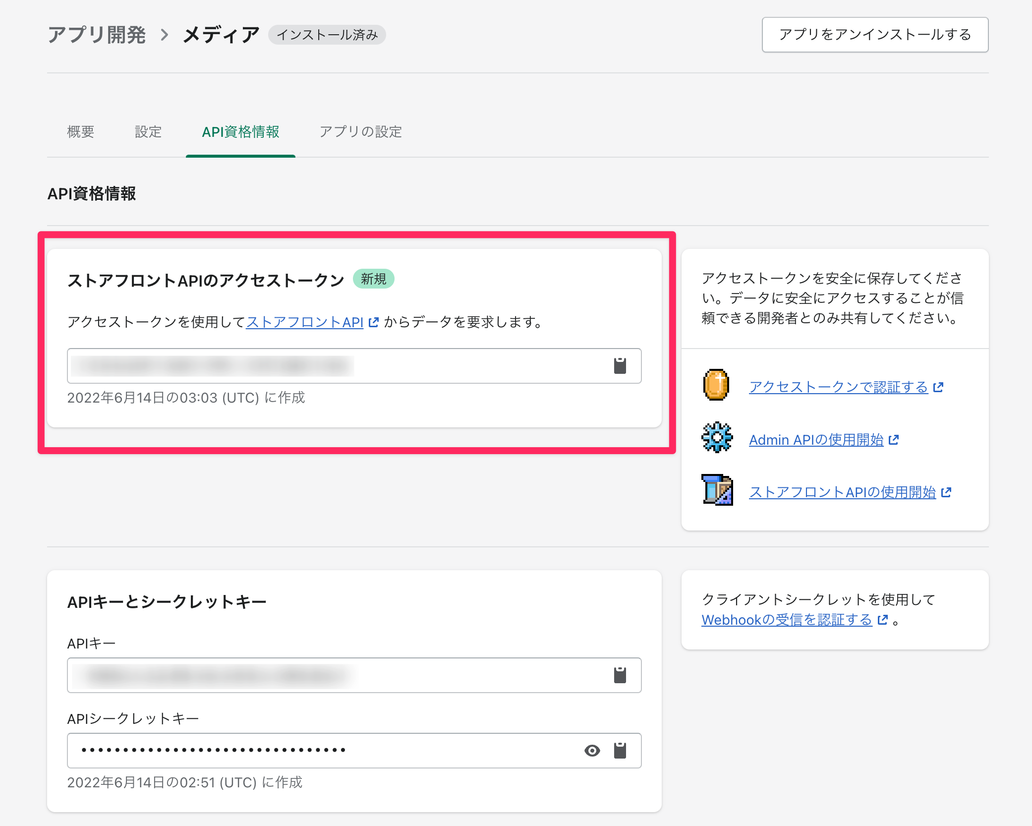 「API資格情報」タブから、「ストアフロントAPIのアクセストークン」を発行します(いくつか操作が必要です)。