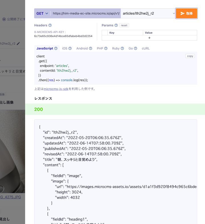 microCMS で作成したコンテンツはAPI経由で利用します。