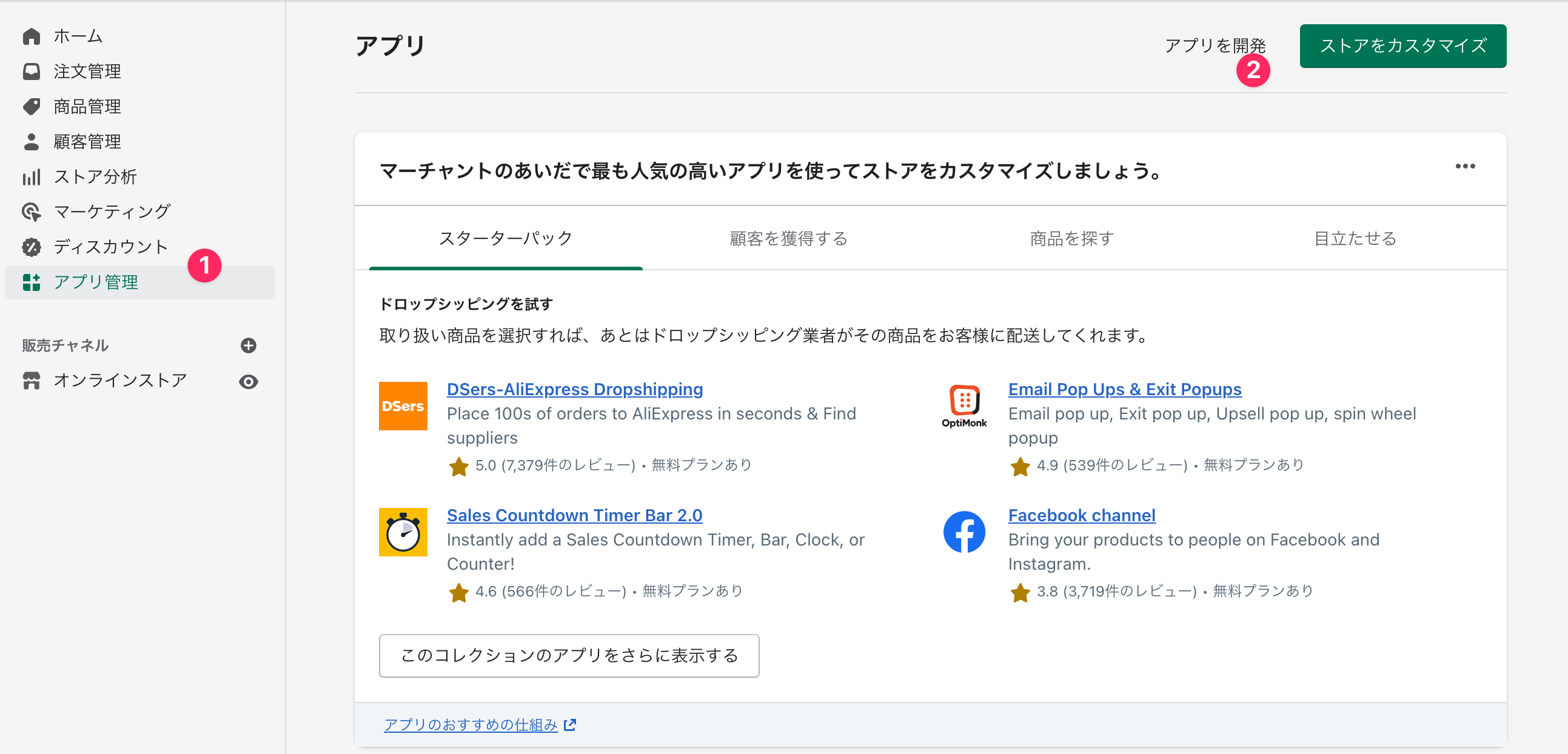 まず、サイドメニューの「アプリ管理」>「アプリを開発」を選択します。
