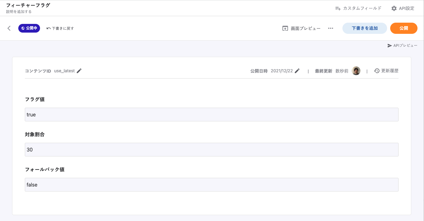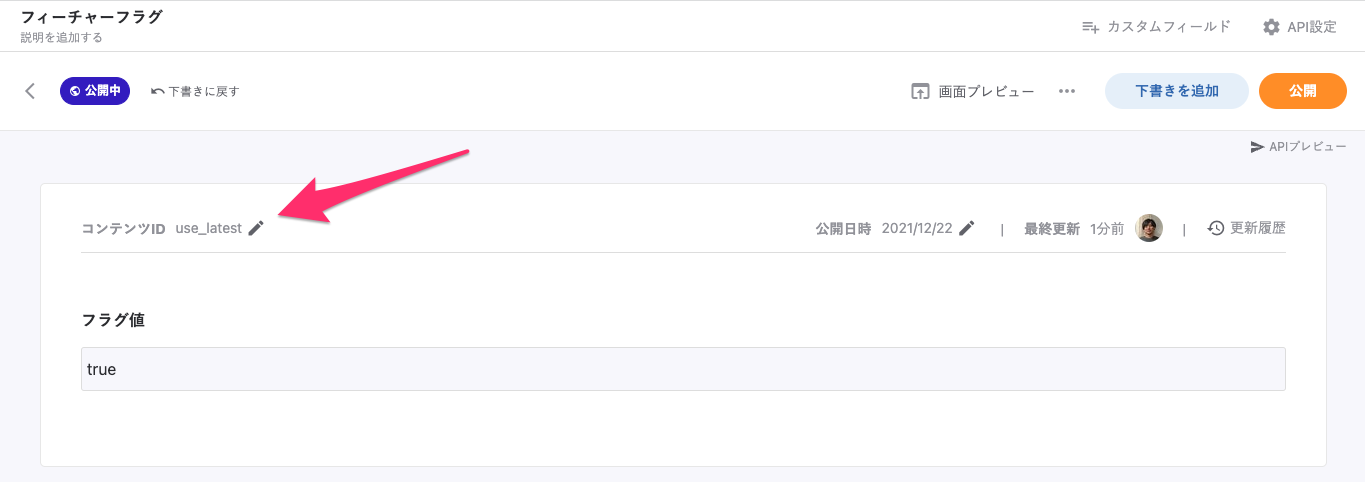 この際にフラグを特定するための「コンテンツID」をわかりやすい文字列にしておくことをお勧めいたします。(スキーマに「説明」を加えるのも良い選択でしょう)