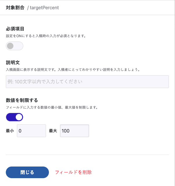 ※ちなみに対象割合は百分率であることがわかりやすいよう、制限をつけておくのがオススメです。