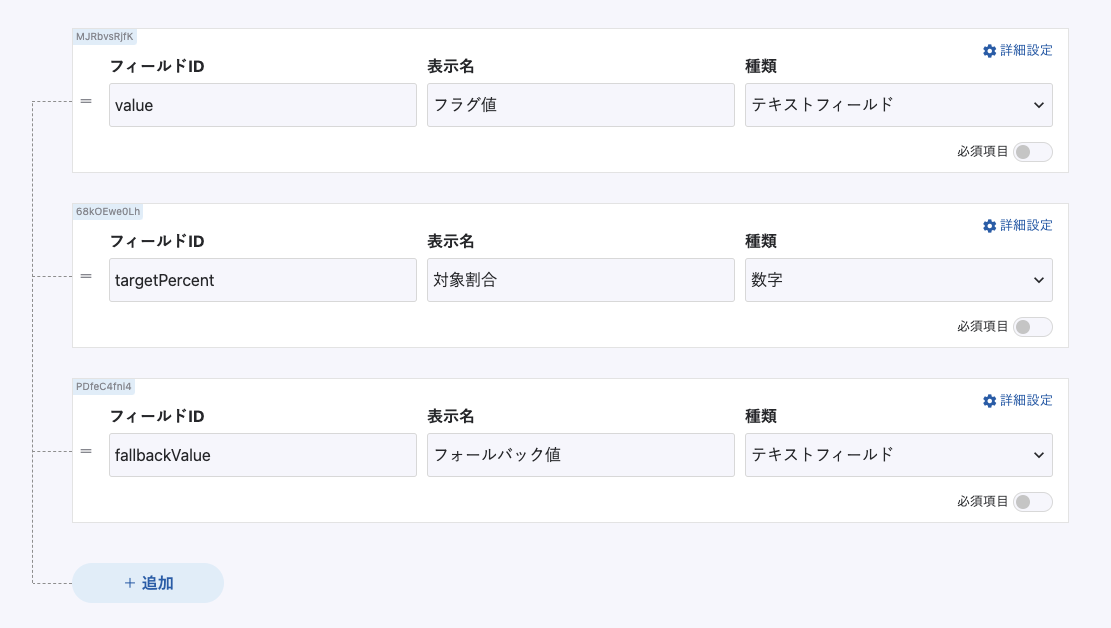 先ほどはシンプルな value のみでしたが、今回はここに対象割合を示す targetPercent (数字)と対象外となったクライアント向けの値である fallbackValue (テキストフィールド)を新たに追加しました。