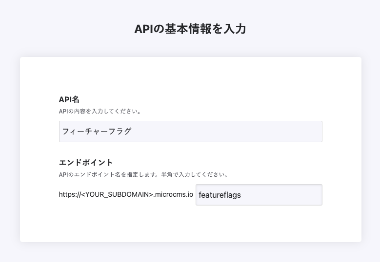 microCMSのアカウントやサービスの登録後(ドキュメント参照)、「フィーチャーフラグ」というAPIを作成してきます。