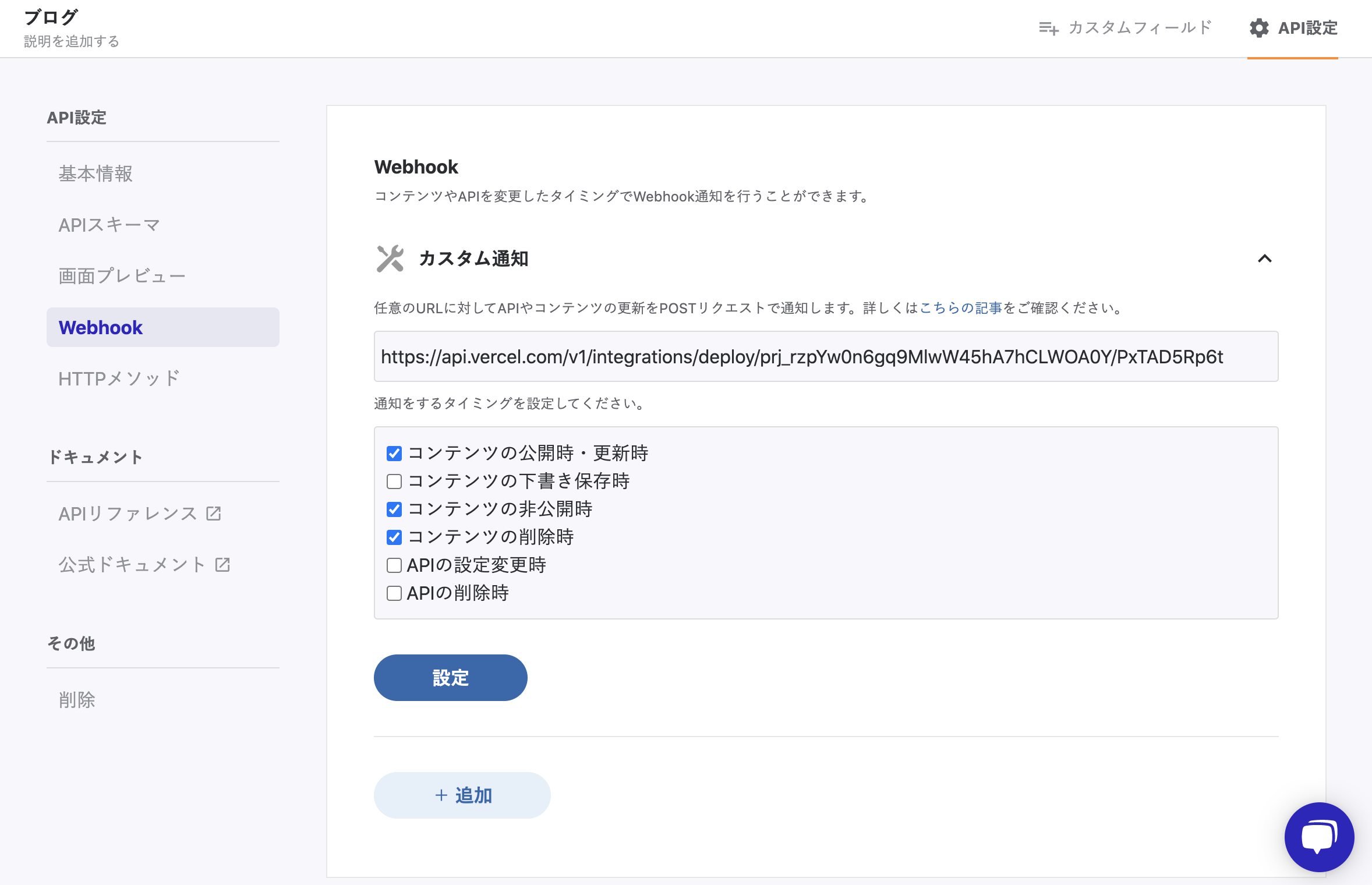 そこで、microCMSのWebhook機能を使って、記事の追加・更新のたびにVercelでビルド&デプロイがされるように設定します。