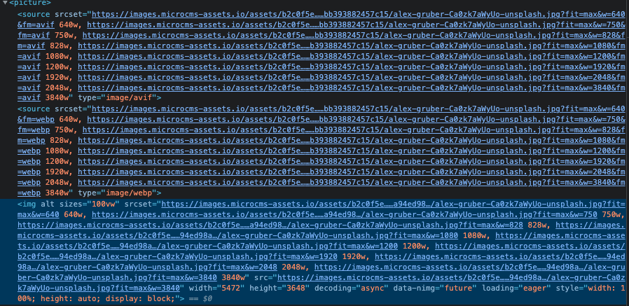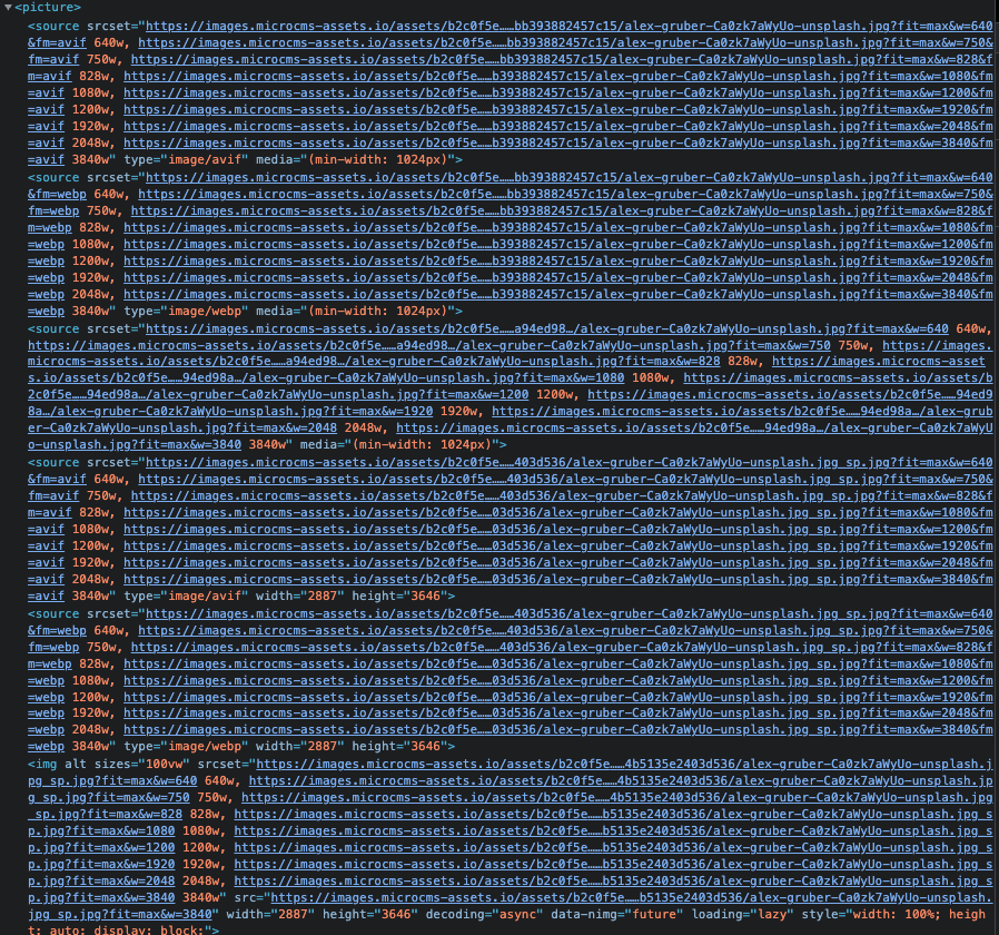 しかし、単一のimgタグをspanタグでラップしてレンダリングされるため、pictureタグを使ってアートディレクションだったり拡張子ごとに画像を出し分けることができませんでした。