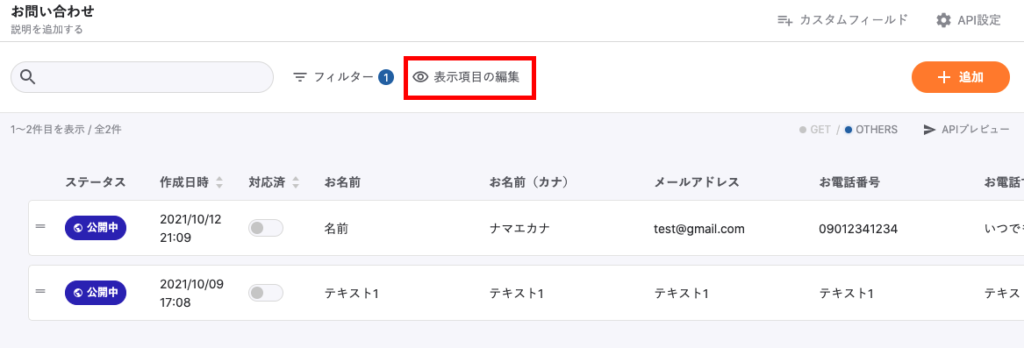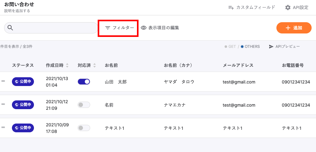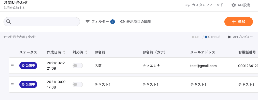 実際のお問い合わせに近いサンプルを用意するために、管理画面から電話番号やメールアドレス、名前カナなどの受信データを増やしています。