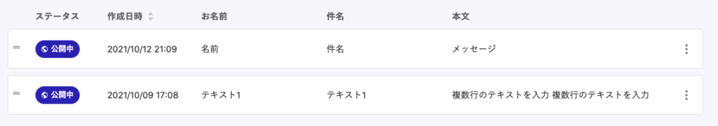 Nuxtのフォームから送信しても良いですが、単純に管理画面から投稿しても大丈夫なので、やりやすいほうでお問い合わせを1件投稿しましょう。