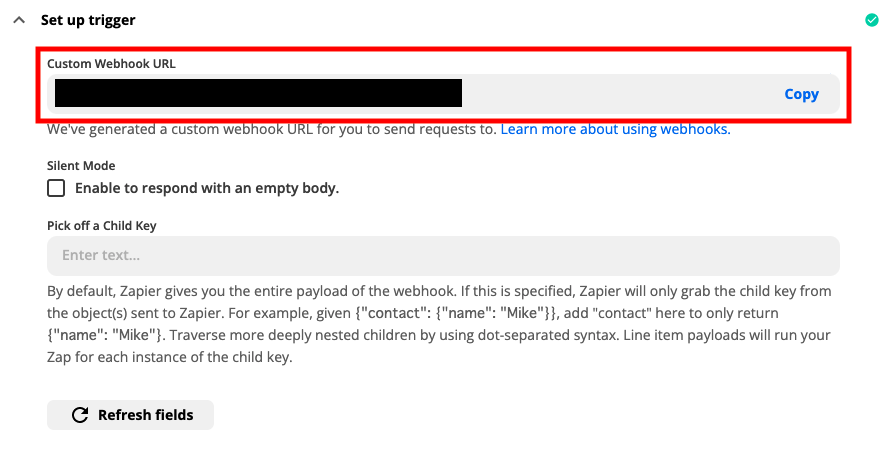 続いてSet up triggerのセクションでcustom Webhook URLが発行されるのでコピーします。