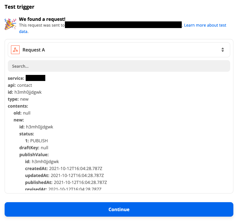 投稿ができたらTest triggerボタンを押し、うまくできれば下記のように表示されるのでContinueを押して次に進みましょう。