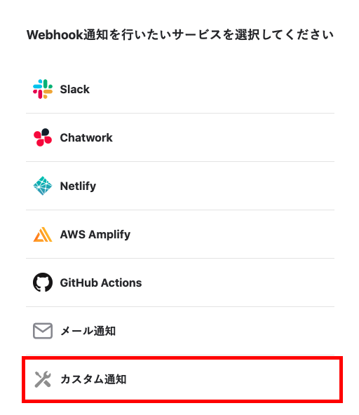microCMSの管理画面に戻り、お問い合わせ > API設定 > Webhook > 追加 と進み、カスタム通知を選択します。