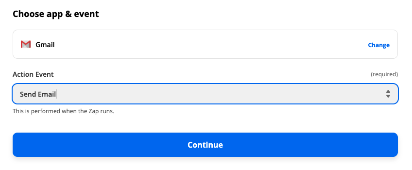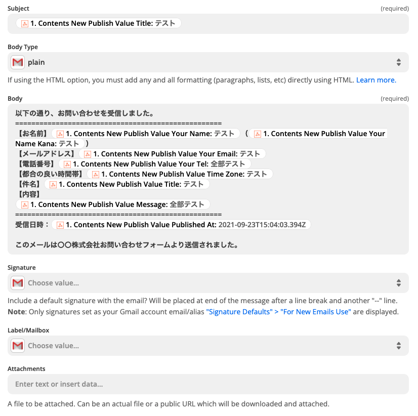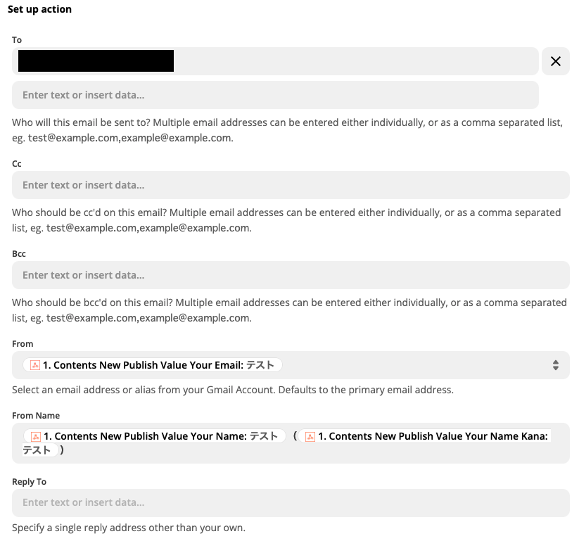 次のSet up actionの画面では、先程のTest triggerで受信したデータを元に自動送信メールの宛先や送信内容などの設定ができますので、お好きな内容で設定してみてください。