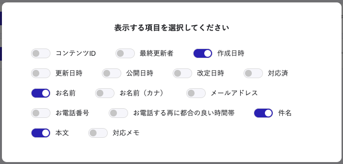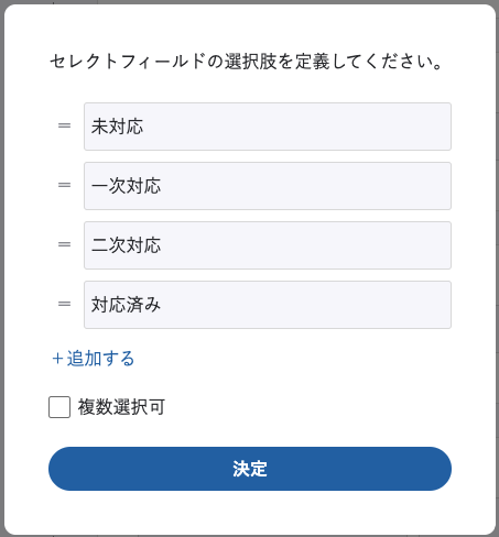 お問い合わせから対応完了まで対応段階がある場合には、セレクトフィールドを作成して対応の進捗状況を設定するととても分かりやすくなります。