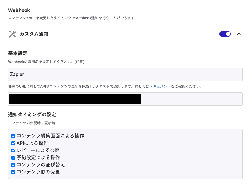 Webhookの識別名にZapierとつけ、先程ZapierでコピーしたWebhookのURLを貼り付けて更新しましょう。