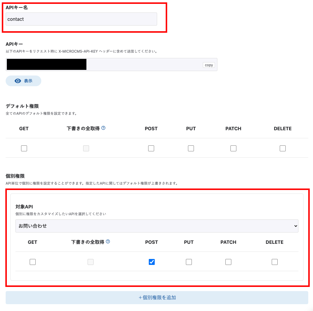 お問い合わせの個別権限を追加して、GETのチェックを外します。