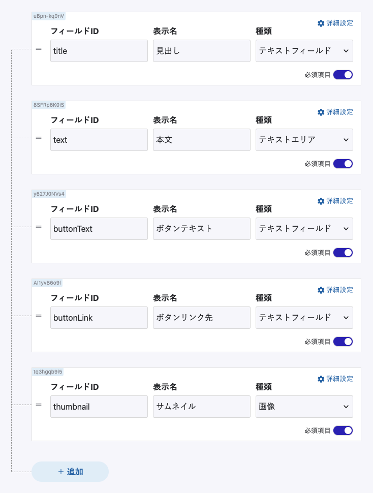 今回は管理画面での見やすさを考慮して繰り返しフィールドとして追加します。
