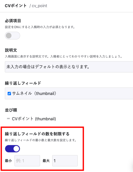 cv_pointの詳細設定で繰り返しフィールドの数を最大1に設定します。