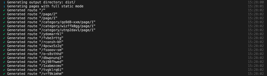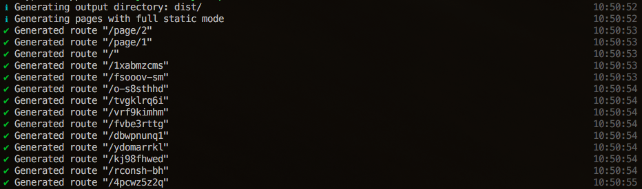 また、以前は動的なルーティングパスに関しては全てこちらに指定してあげる必要がありましたが、最近はNuxt側で内部的なクロールによって動的なルーティングパスを検知してくれるようになったので、最小限の指定で済むようになりました。