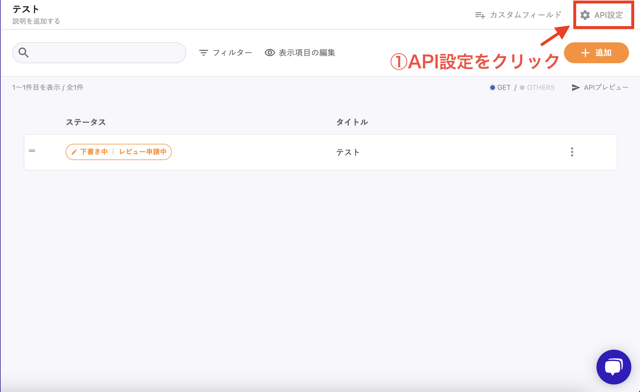 まずは、 コンテンツ(API)の「API設定」をクリックします。