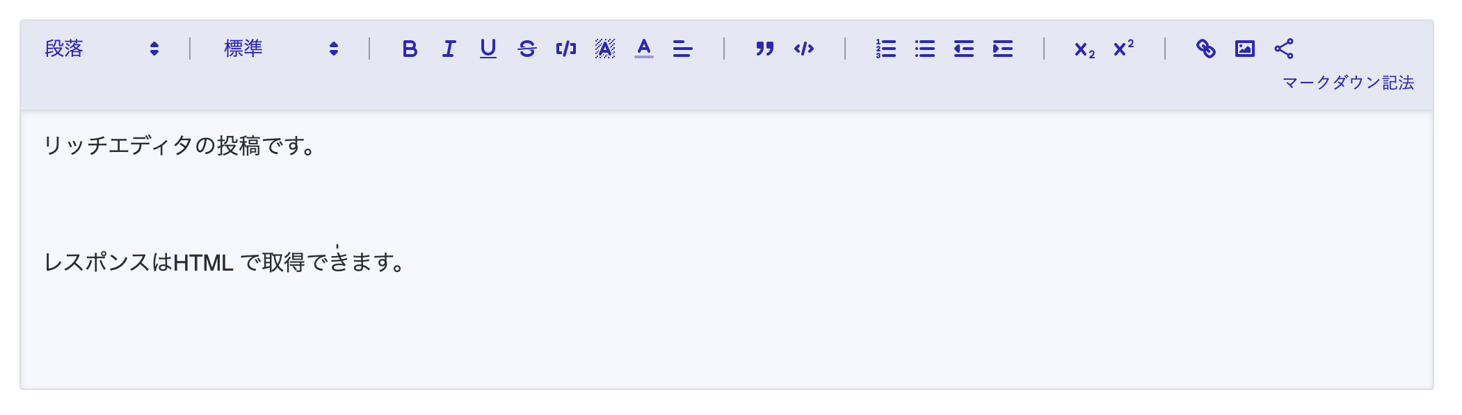 "<p>リッチエディタの投稿です。</p><p><br></p><p><br></p><p>レスポンスはHTML で取得できます。</p>",