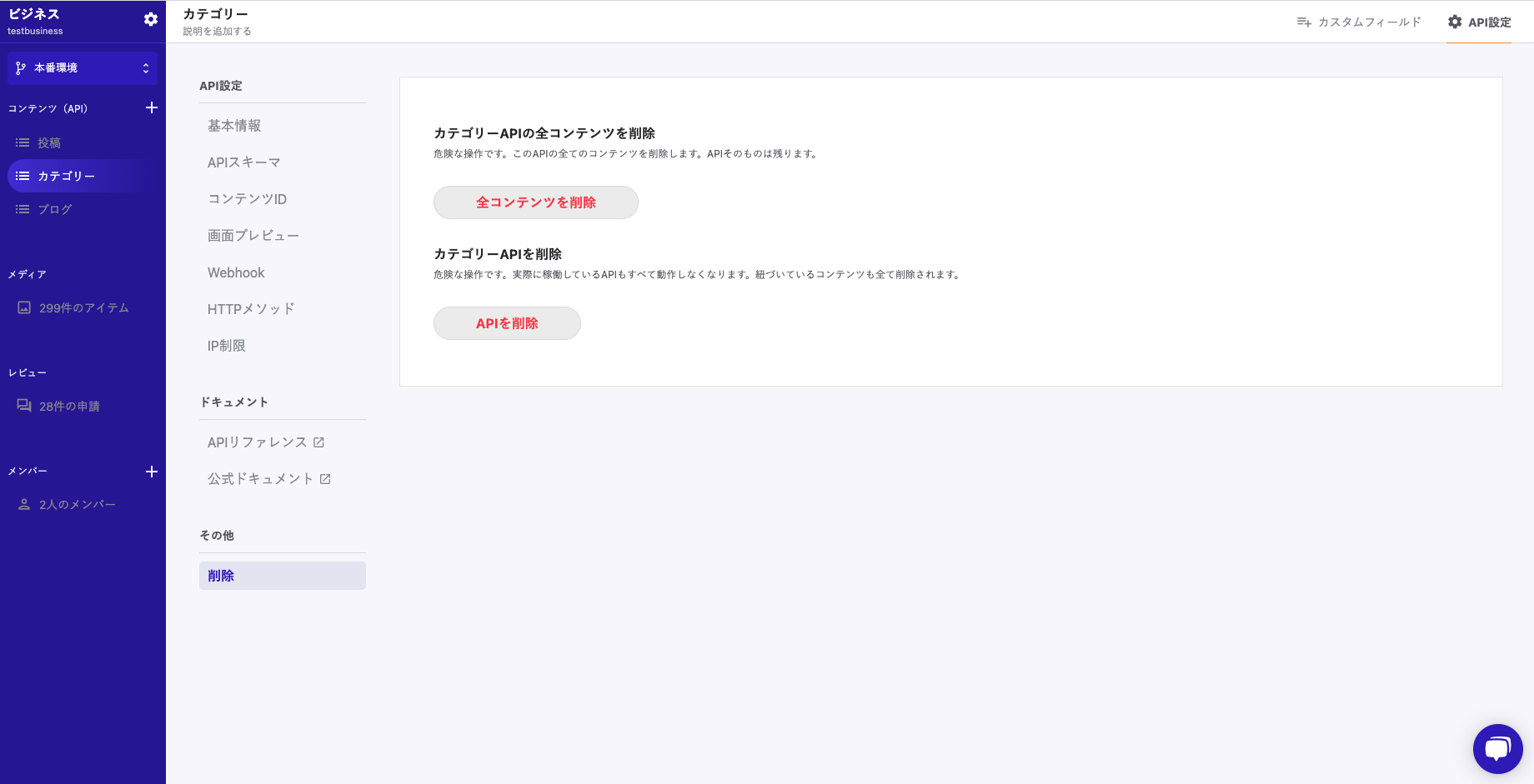 以下の画像の例ですと「カテゴリー」API内に「投稿」APIに参照されているコンテンツがあるので、「全コンテンツ削除」「APIを削除」することが出来ません。
