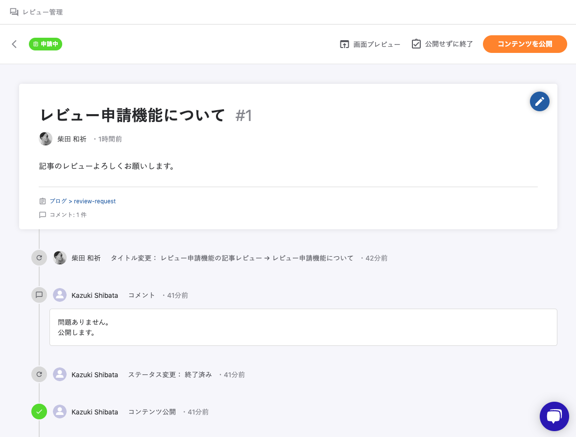 そうするとレビューは終了し、その場でコンテンツが公開されます。