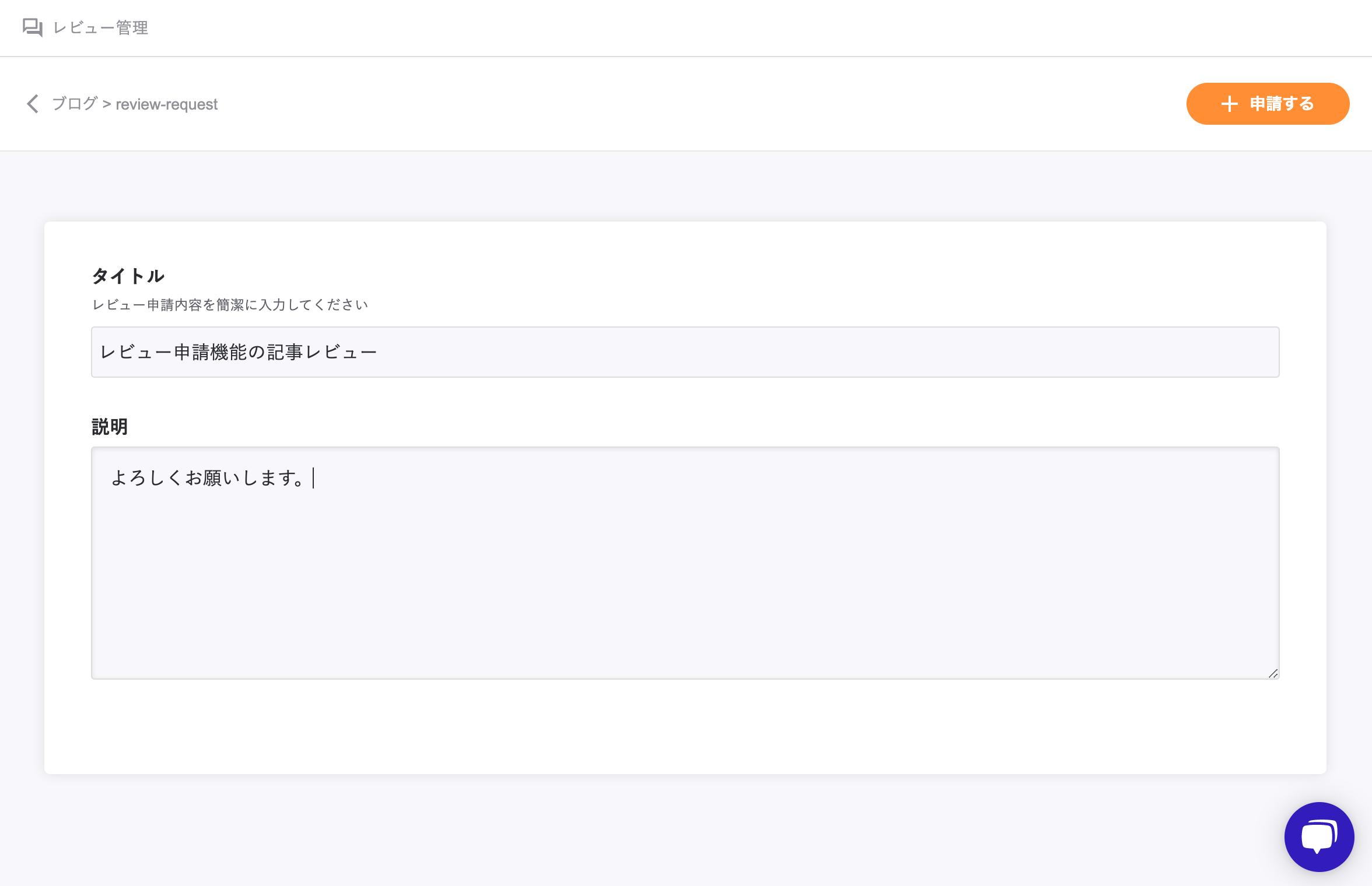 こちらをクリックすると、レビュー申請画面に遷移し、タイトルと説明(任意)を入力することで申請を出すことができます。